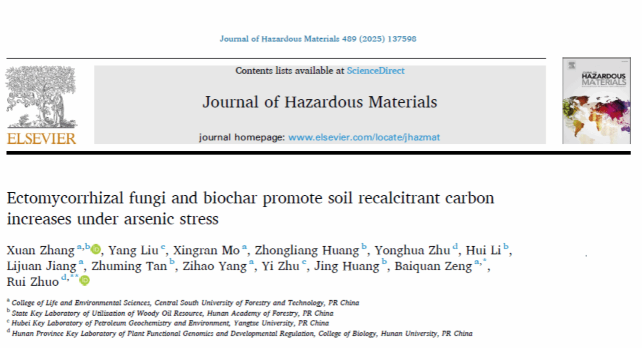近日,我院曾柏全教授团队在重金属污染生态修复研究领域取得重要进展,团队研创的外生菌根植物-生物炭联合生物修复技术,实现了对矿区砷污染土壤“减污降碳”协同增效。主要研究成果以“Ectomycorrhizal fungi and biochar promote soil recalcitrant carbon increases under arsenic stress”为题,发表于Journal of Hazardous Materials (中科院一区TOP期刊,2024 影响因子为12.2),论文系统阐述了外生菌根真菌与生物炭介导矿区土壤中砷迁移转化和顽固性碳形成的作用机制。
