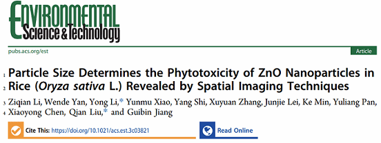 Ziqian Li, Wende Yan, Yong Li*, Yunmu Xiao, Yang Shi, Xuyuan Zhang, Junjie Lei, Ke Min, Yuliang Pan, Xiaoyong Chen, Qian Liu*, and Guibin Jiang. Particle Size Determines the Phytotoxicity of ZnO Nanoparticles in Rice (Oryza sativa L.) Revealed by Spatial Imaging Techniques. Environ. Sci. Technol. 2023, 3c03821.