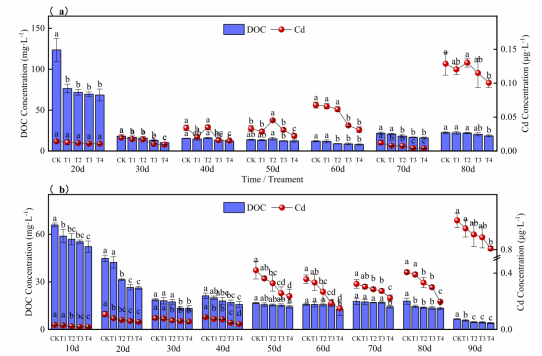 4. 不同量的秸秆离田措施,带来了土壤孔隙水中溶解性有机碳(DOC)和可溶性Cd含量的大幅降低,且两者呈现正相关关系,这有利用土壤Cd生物有效性和迁移能力的降低(图3)。