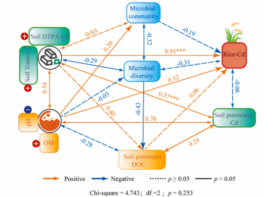 5. 利用回归分析和网络分析发现,土壤pH是影响土壤Cd生物有效性和微生物群落多样性的主控因素,且在两地晚稻种植过程中土壤环境因子与土壤微生物的交互关系更加复杂(图4);利用路径分析则发现土壤Cd总量和Cd有效态含量是决定稻米Cd含量的直接路径,而这两个因素受土壤有机质和pH的影响(图5)。