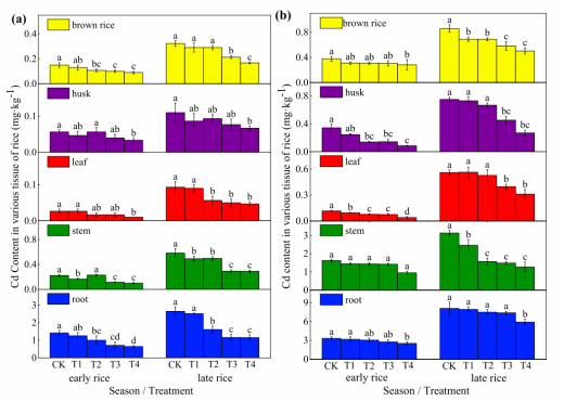 1. 不同量的秸秆离田措施均能够降低水稻植株对Cd的吸收积累,其中在轻度Cd污染稻田,秸秆和根系的全部离田措施能够使早稻和晚稻稻米Cd含量均低于0.2mg/kg,实现水稻的安全种植(图1)。