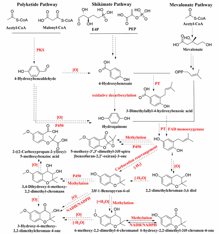 ▲Panus lecomtei 中prenyl quinone杂萜可能的生物合成途径