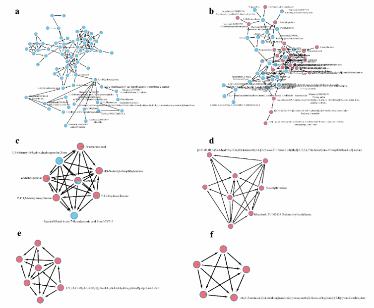 基于MS/MS数据通过GNPS分析,获得了新粗毛革耳中与prenyl quinone类次级代谢产物相关的两个主要簇(a-b),随后通过对分子网络进行MCODE分析,获得了该菌中次级代谢产物的关键子网络(c-f),主要为prenyl quinone类化合物及黄酮类化合物。