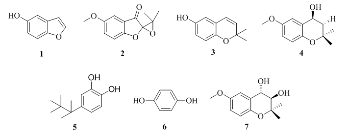我院生物学科微生物生理代谢与绿色发酵团队,全面分析了新粗毛革耳中prenyl quinone类化合物及其合成途径。首先通过非靶向代谢组学结合全球分子网络平台(GNPS),对三组新粗毛革耳发酵提取物中的代谢产物进行了综合分析,揭示了新粗毛革耳中主要的次级代谢产物类型及可能的转换关系,并获得了2000多个差异代谢产物;具体通过现代分离纯化技术,分离鉴定获得7个prenyl quinone类化合物,其中化合物3(2,2-dimethyl-2H-1-benzopyran-6-ol)展现出良好的抗氧化活性;化合物5( 4-(1′,1′,2′,2′-tetramethylpropyl)-1,2-benzenediol)为首次在真菌中发现。