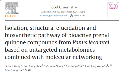 进一步基于已有化合物信息及代谢网络数据构建了新粗毛革耳中prenyl quinone类代谢产物基本生物合成路径。研究成果以“Isolation, structural elucidation and biosynthetic pathway of bioactive prenyl quinone compounds from Panus lecomtei based on untargeted metabolomics combined with molecular networking”为题,于2024年9月12日发表在农林领域国际主流期刊《Food Chemistry》(中科院 1区Top,IF 8.5)。论文第一作者为2021级博士生王思贤,通讯作者为刘高强教授和王晓玲副教授,第一单位为中南林业科技大学。