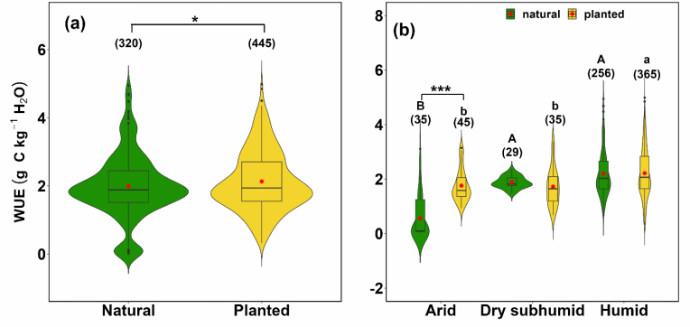 图3 全球人工林和天然林水分利用效率在干旱区、半干旱半湿润区、湿润区分布