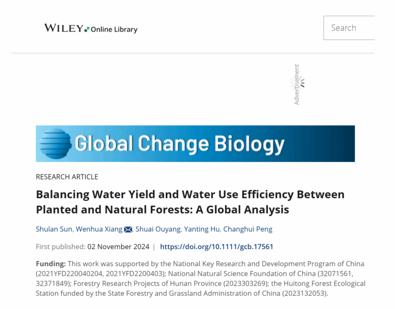 文章链接:Sun, S., Xiang, W., Ouyang, S., Hu, Y. and Peng, C. (2024), Balancing Water Yield and Water Use Efficiency Between Planted and Natural Forests: A Global Analysis. Global Change Biology., 30: e17561. https://doi.org/10.1111/gcb.17561
