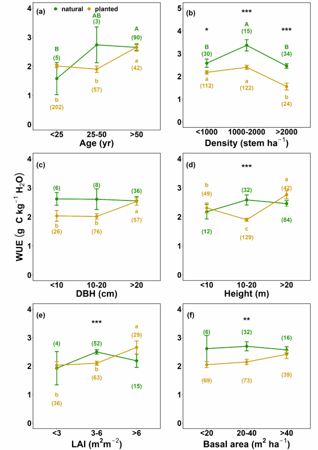 图5 全球人工林和天然林水分利用效率在不同林分特征组的分布及差异
