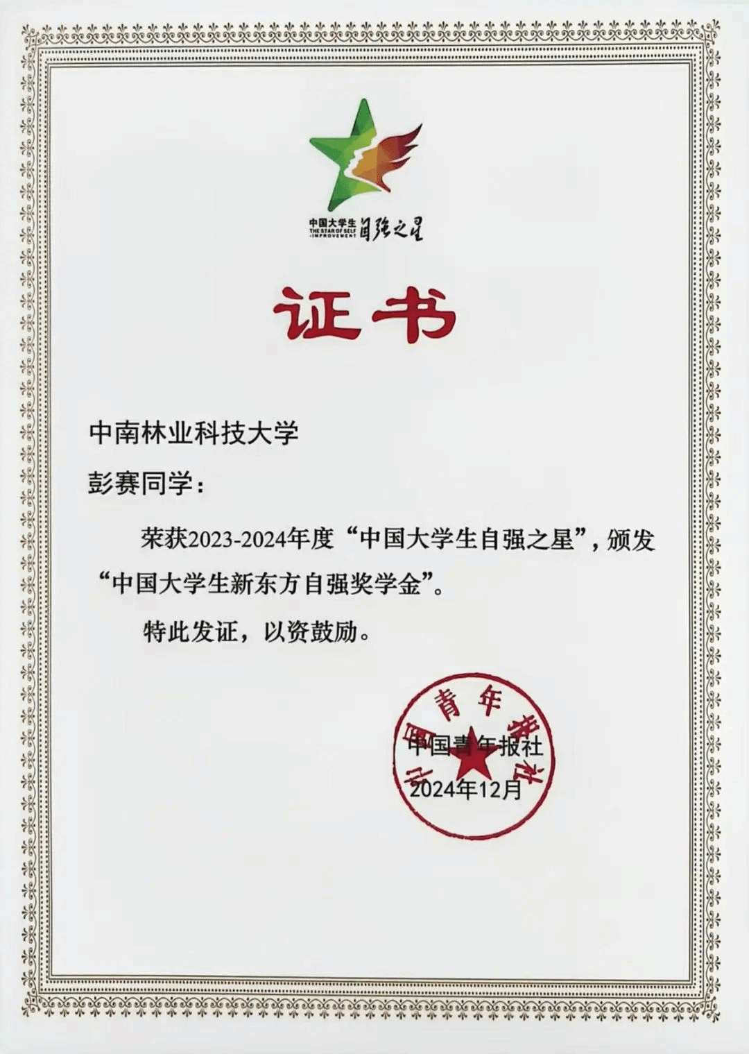 近日由共青团中央、全国学联指导团中央基层建设部、中国青年报社主办的2023-2024年度“中国大学生自强之星”奖学金推报活动结果揭晓我院2021级本科生彭赛“中国大学生自强之星”称号
