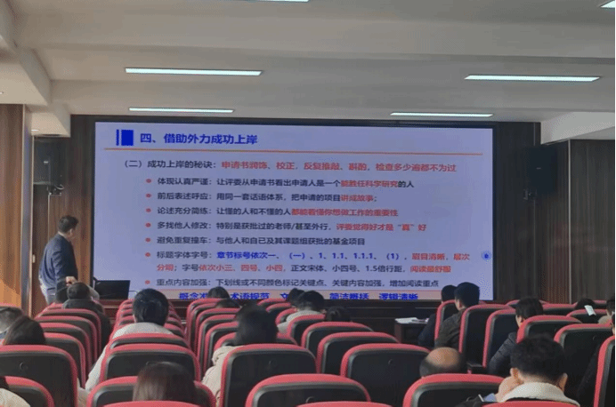 项院长将申报基金与助力导师提升科研素质的关系作为本次培训的主题,从“认真做足前期功课”“谋划构思选题内容”“集中讲好一个故事”“借助外力成功上岸”四个方面对申报基金进行了详细解读。他指出“选题是申报成功与否的关键”,要面向世界科技前沿、经济主战场、国家重大需求和人民生命健康,并围绕所在团队发展目标来确定项目选题。申报书写作要聚焦关键科学问题,集中讲好一个故事,从不同的侧面谋篇布局,撰写具有学术价值的高质量申请书。最后,项院长强调,申报基金需要扎实的学识,要有勤学笃行,求是创新的科研态度,同时他鼓励青年教师涵养扎实学识,不断提升自身素质能力。