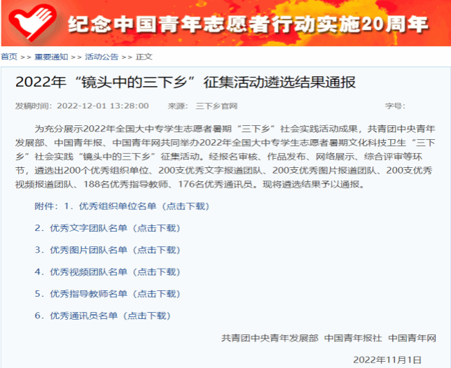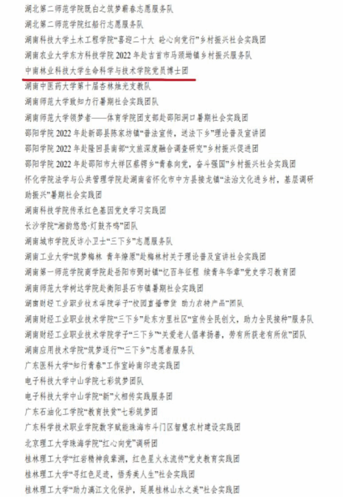 (生科学院)近日,团中央公布2022年全国大中专学生志愿者暑期“三下乡”社会实践“镜头中的三下乡”活动遴选结果,我校生命科学与技术学院党员博士赴湖南省岳阳市东洞庭湖生态区绿色发展调研团荣获优秀图片团队。