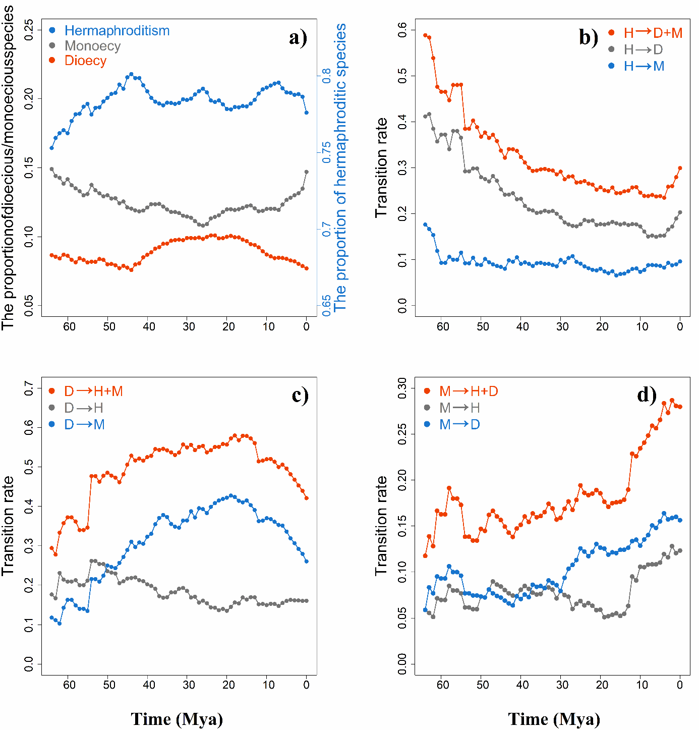 该研究通过收集68453种被子植物的性系统及物种分布数据,首次刻画了被子植物性系统(sexual system)的全球地理格局,并评估了新生代以来被子植物性系统的演变趋势。研究表明,雌雄异株和雌雄同株异花的比例随纬度升高而升高,而两性花植株则在温暖干旱的地区有着更高的比例(图1)。自新生代以来,(从两性花和雌雄同株异花)向雌雄异株的转化比例高于(从雌雄异株和雌雄同株异花)向两性花的转化比例,这表明雌雄异株不是进化的盲端(evolutionary end-point)(图2)。当古温度(paleo-temperature)大于零摄氏度时,两性花与雌雄异株之间的转化随温度升高而增加,向雌雄同株异花的演变比例则随温度升高而下降。该研究从宏观生态学的角度刻画了被子植物性系统的生物地理格局及其进化转变方向,揭示了性系统状态不仅是遗传表达的结果,也是被子植物在有性生殖过程中对环境气候的适应,丰富了植被结构组成的功能性状驱动机制,加深了人们对植物多样性格局及其对气候变化的响应的理解。