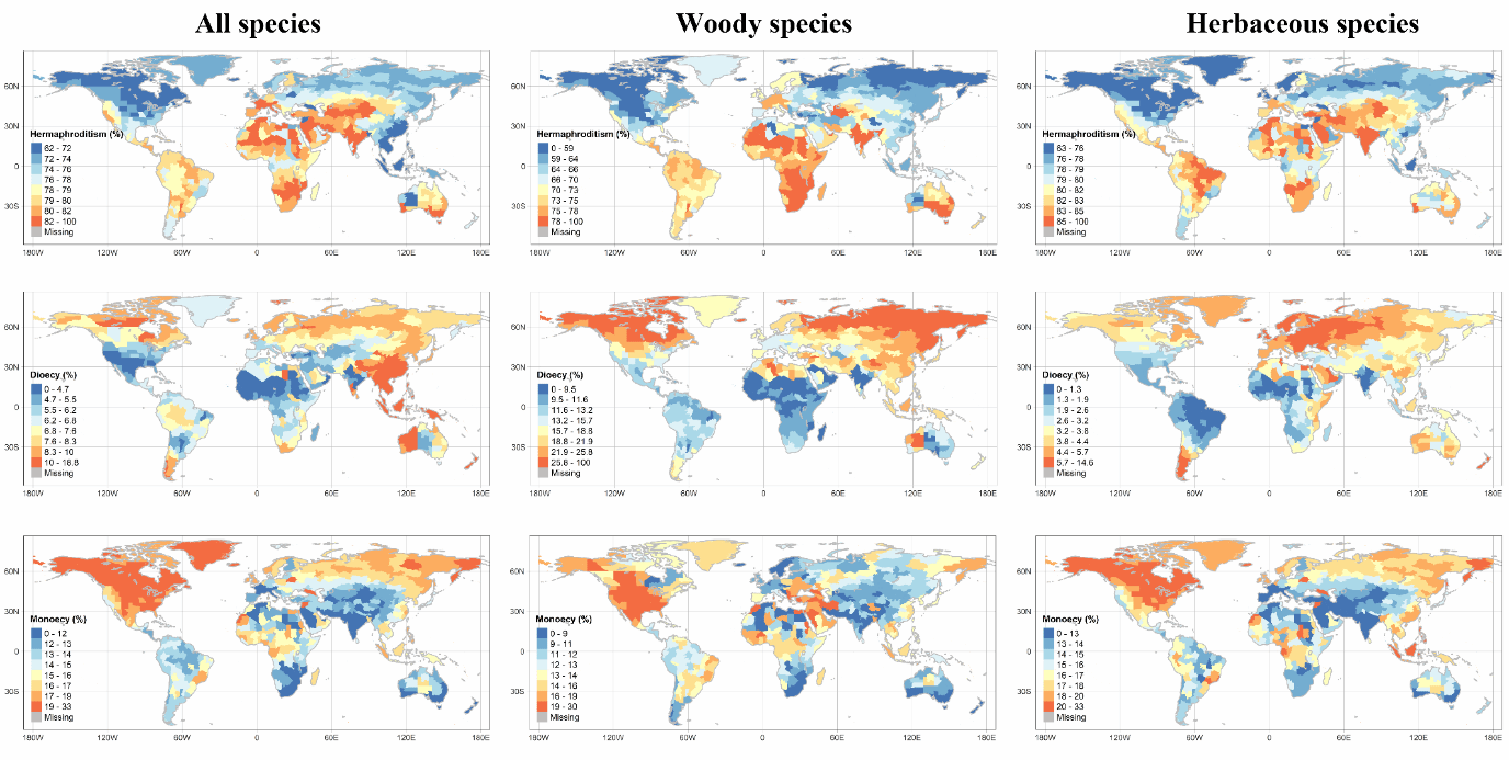 图1 被子植物性系统(Hermaphroditism-两性花,Dioecy-雌雄异株,Monoecy-雌雄同株异花)的全球地理格局