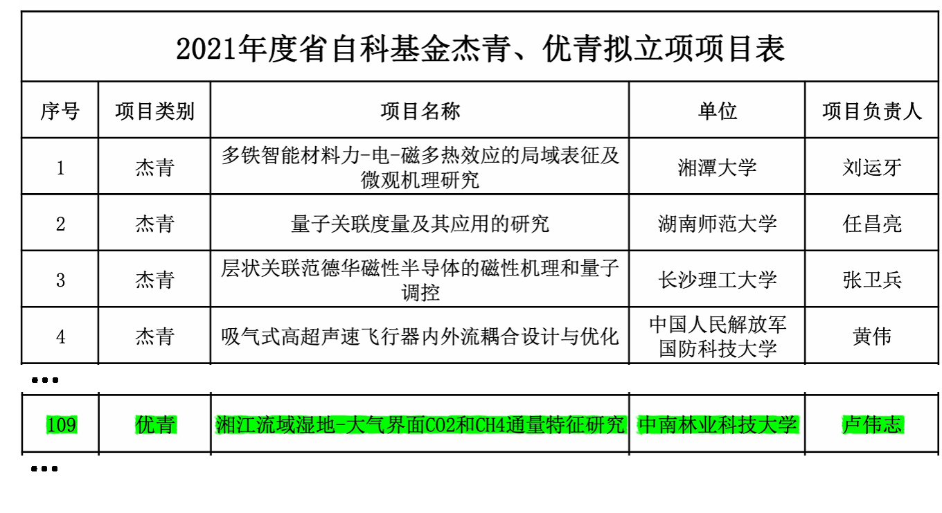 近日,湖南省科学技术厅公布了2021年湖南省自然科学基金优秀青年基金评审结果且公示结束,我院生态学卢伟志副教授以“湘江流域湿地-大气界面CO2和CH4通量特征研究”获2021年度湖南省自然科学优秀青年基金项目立项,且项目获得2021年中央引导地方科技发展资金湖南省第二批资助。
