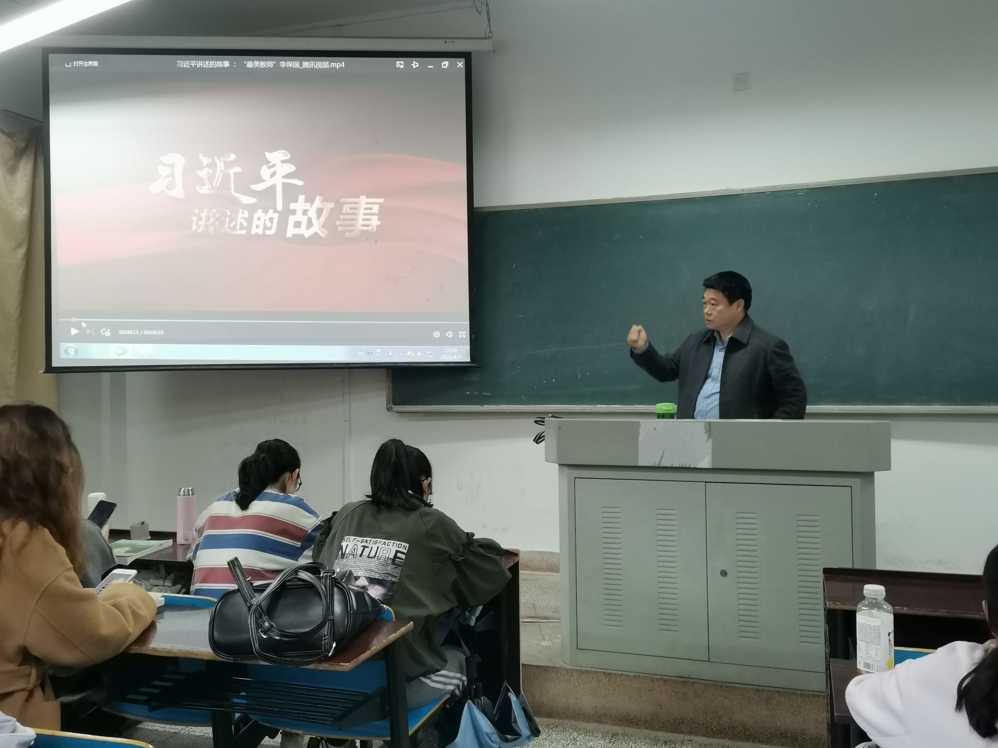“在河北有这样一位老师,他教书育人的身影不仅出现在三尺讲台上,还常常会出现在太行山深处。习近平总书记称他是‘新时期共产党人的楷模,知识分子的优秀代表,太行山上的新愚公’,他就是我们的优秀校友——李保国”,4月7日,在2019级生态学本科生的《自然资源生态学》课堂上,授课教师王光军教授以“习近平讲述的故事”为主题,用五分钟左右的时间给同学们深情讲述了李保国教授的先进事迹和崇高精神,与此同时,吴耀辉副教授、何含杰副教授也分别以《中国共产党发展史》、《秋收起义》为主题,在讲述专业课之前给2018级生物工程1班、2班同学们上了一堂简短而生动的党史教育课。