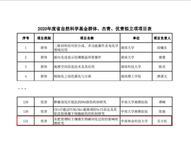 近日,湖南省科学技术厅公布2020年湖南省自然科学基金创新研究群体、杰出青年基金、优秀青年基金项目结果(公示期为2020年3月23日至27日),我院生态学吴小红副教授的“水肥管理对土壤微生物碳同化过程的影响机理研究”课题获得优秀青年基金项目资助。