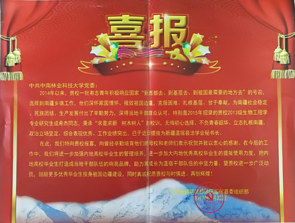 近日,我校收到一份来自新疆阿克苏地区温宿县县委组织部寄来的喜报。喜报中说:近年来我校服务新疆南疆乡镇的毕业生工作突出,深得当地干部群众认可。他们当初积极响应国家号召,志愿服务基层,到西部、到祖国最需要的地方去工作,克服困难,扎根基层,为新疆社会稳定、民族团结和生产发展做出了贡献。毕业于我院的2015届毕业生成希杰,当初放弃内地优越工作机会,选择到新疆阿克苏地区温宿县乡镇基层工作。由于各方面表现优秀、工作突出,近日被提拔为新疆阿克苏温宿县法学会秘书长,为我院到基层就业的毕业生树立了榜样。